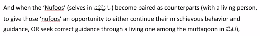 বিস্ময়কর কোরআনঃ এবং যখন সকল ‘নুফুস’ (ব্যক্তি) তাদের প্রতিরুপ* দ্বারা প্রভাবিত হয় (তাদের স্বতন্ত্র ও সমষ্টিগত ‘ইবলিস’, অর্থাত্, তাদের সম্মিলিত ও স্বতন্ত্র ভ্রান্ত ধারণা, পক্ষপাতিত্ব এবং পূর্বনির্ধারণ), এবং যখন ‘নুফুস’ (নিজেদের মধ্যে) তাদের পতিরূপ হয়ে জুটিবদ্ধ হয় (একজন জীবিত ব্যক্তির সাথে, সেই ‘নুফুস’দের তাদের দুষ্ট আচরণ এবং দিকনির্দেশনা চালিয়ে যাওয়ার সুযোগ দেওয়ার জন্য, অথবা মুত্তাকুনদের মধ্যে জীবিত ব্যক্তির মাধ্যমে সঠিক দিকনির্দেশনা খোঁজার জন্য),