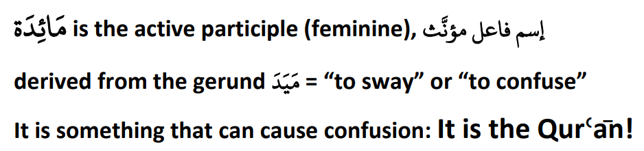 | যখন ‘হাওয়ারি-ইউন’রা বললো: “হে মরিয়ম-পুত্র, ঈসা! তোমার পালনকর্তা কি আমাদের উপর আকাশ থেকে একটি ‘মায়িদাহ’ অবতীর্ণ করতে পারেন (পুনঃপুনভাবে)?“ সে (ঈসা) উত্তর দিল: “পবিত্র শব্দকোষ ব্যবহারে সুশৃঙ্খল হও, যদি তোমরা বিশ্বাসী হও (যেমনটি তোমরা দাবি কর)।” | When the ‘Ḥawāriy-yūn’ said: “O Ɛīssā, Son of Maryam! Can your lord bring down upon us (repeatedly) a ‘MāꜤidah’ from heaven?” He (Ɛīssā) replied: “Be disciplined in your usage of the divine lexicon if you are (as you claim,) believers!” |