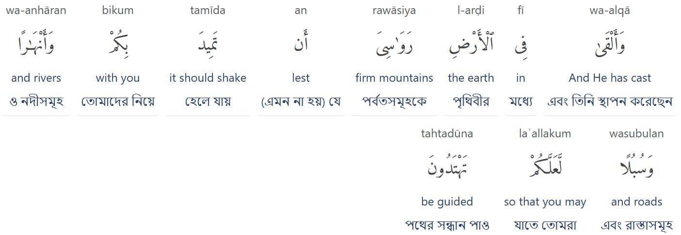| এবং তিনি (আল্লাহ) কিতাবে স্থিরতা লাভ করার নীতি প্রদান করেছেন, যাতে তা তোমাদের সাথে দোদুল্যমান না হয়, এবং (পরস্পর সংযুক্ত) নদী ও পথ। যাতে তোমরা পথনির্দেশনা খুঁজতে পার। | And he (Allahh) provided in the scripture anchoring principles, lest it sways with you, and (interconnected) rivers and pathways. Perchance you may seek guidance, |