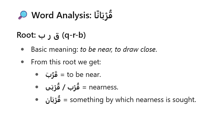 এবং আল্লাহ এক মানব (নশ্বর, ঘুরাব) প্রেরণ করলেন, যে কিতাবের মাধ্যমে দিকনির্দেশনা অনুসন্ধান করে, (আল্লাহর উদ্দেশ্য) তাকে দেখানো যে কিভাবে আল্লাহ্ তার থেকে (যা সে মনে করেছিল) তার ভাইয়ের বিচ্যুতি তা আড়াল করেছেন। সে বলল: “আমি কী ভয়ঙ্কর কাজ করেছি! আমি কি এই মানুষ (ঘুরাব) এর মতো হতে অক্ষম ছিলাম, যাতে আমি বুঝতে পারতাম কীভাবে আমার ভাইয়ের বিচ্যুতি আমার কাছে আড়াল করা হয়েছে?” এবং এভাবে, সে অনুতপ্তদের মধ্যে পরিণত হল। (5:31)