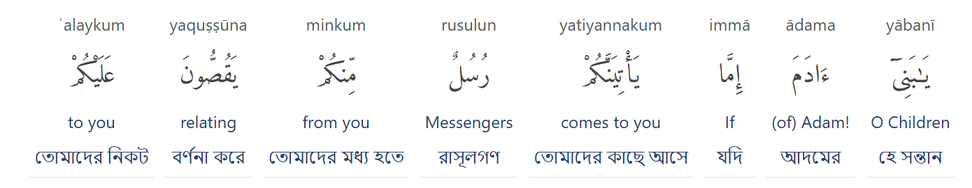 হে আদমের অনুসারীরা, যদি তোমাদের মধ্য থেকে তোমাদের কাছে কোনো দূত আসে, আমার আয়াতসমূহ (দিয়ে গল্পের টুকরোগুলি) তোমাদের কাছে বর্ণনা করে, তাহলে যারা সুশৃঙ্খল হয় (কিতাবে নিযুক্ত হতে) এবং আসমানী শব্দকোষ প্রয়োগ করে, তাদের ওপর কোনো ভয় আসবে না, এবং তারা দুঃখিতও হবে না। (7:35)