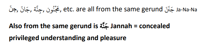 এই একই মূল ধাতু (gerund) থেকে এসেছে জান্নাহ (جنة) — যার অর্থ হলো: