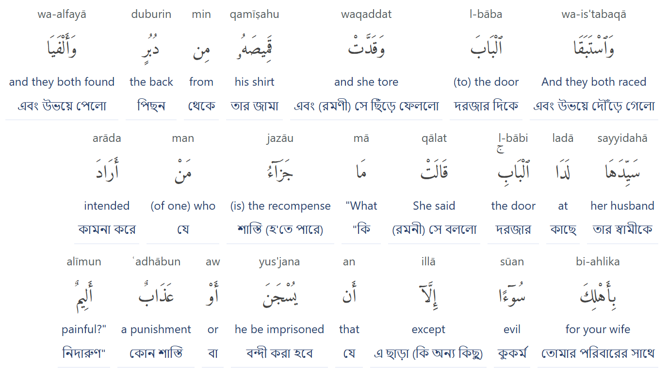 | এবং তাই, যখন (গুজব ছড়ানো) নারীদের প্রতারণার খবর তার (শ্রদ্ধেয় ব্যক্তির অধীনস্থ নারীর) কাছে পৌঁছাল, সে তাদের কাছে (বার্তা বা দূত) পাঠাল, এবং তাদের জন্য প্রস্তুত করল এক দায়মুক্তিমূলক আইনি প্রতিরক্ষা (অর্থাৎ, আইনি শাস্তি এড়ানোর কৌশল), এবং সে প্রত্যেককে একটি করে ছুরি দিল (ইউসুফকে ছুরিকাঘাত করার জন্য)। (এরপর) সে (নারী) বলল (ইউসুফকে): “যাও তাদের কাছে প্রচার করো (গুজব খণ্ডন করতে)!” এবং যখন (গুজব ছড়ানো) নারীরা তার দৃষ্টিভঙ্গি দেখল, তারা তাকে সম্মান করল (অর্থাৎ, তার মতামতকে বৈধ মনে করল), এবং তারা ষড়যন্ত্রকারীদের প্রতি তাদের সমর্থন ছিন্ন করল, এবং তারপর তারা বলল (ইউসুফের উপস্থিতিতে, কী বলবে তা নিয়ে পরিকল্পনা করতে, পরবর্তীতে শ্রদ্ধেয় ব্যক্তির অধীনস্থ নারীর সাথে তাদের ব্যর্থ হত্যার প্রচেষ্টা সম্পর্কে আলোচনার প্রস্তুতির জন্য): “সে আল্লাহর পক্ষ নিল! এটি মানুষের (কার্য) ছিল না! এটি ছিল কেবল অলৌকিক ক্ষমতাসম্পন্ন এক দেবদূত!” | And so, when news about the (gossiping) women’s deception reached her (the Reverent One’s subordinate woman), she sent (a message or a messenger) to them, and readied for them an exonerating legal defense (i.e., a legal punishment evasion strategy), and she provided a knife to each of them (to stab Yūssuf). (After that) she said (to Yūssuf): “Go preach to them (to denounce the rumors)!” And when the (gossiping) women saw his point of view, they respected him (i.e., considered his opinion valid), and they severed their support for the conspirators, and then they said (strategizing in Yūssuf’s presence, about what to say, in preparation for their debriefing later with the Reverent One’s subordinate woman regarding their failure to assassinate Yūssuf): “He took the side of Allah! This was not (the feat of) a human! This was but an angel with miraculous feats!” |