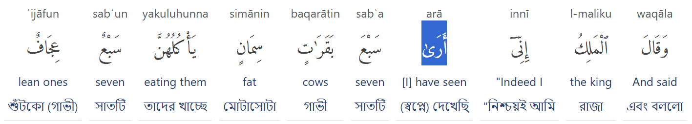| এবং রাজা বলল: “আমি দেখি সাতটি (অর্থাৎ, কিছু) মোটা গাভীকে শীর্ণকায় জন্তুরা (অর্থাৎ, শত্রুরা) খাচ্ছে, এবং কিছু মহিলা লম্বা পশ্চাদেশসহ সবুজ গাউন পরে আছে অন্যদের (নারীদের) সঙ্গী হয়ে, যারা কুঁকড়ে গেছে। হে গণ্যমান্য ব্যক্তিবর্গ! আমার (চাক্ষুষ) প্রতিবেদন সম্পর্কে আমাকে একটি মতামত দিন, যদি আপনারা এ বিষয়ে (একটি) মতামতে পৌঁছাতে সক্ষম হন!” | And the king said: “I see seven (i.e., several) fat cows being fed on by emaciated beasts (i.e., enemies), and several ladies wearing long green gowns with train in the company of others (feminine) who are shriveled. O notables! Provide me an opinion about my (eyewitness) reports, if you are able to cross over to (form) an opinion thereof!” |