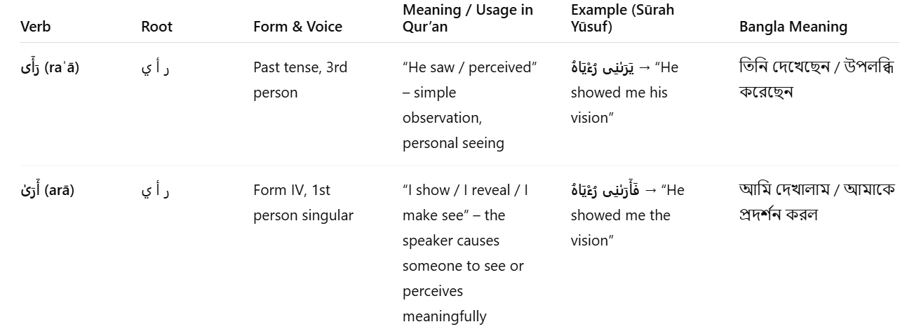 أَرَىٰنِىٓ (arā) = I see myself, or I hold a belief about myself, or someone has told me something about myself; therefore, I have formed an opinion.