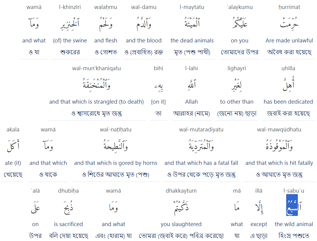 | “তারপর, এর ফলস্বরূপ (যারা লম্বা প্রান্তযুক্ত পোশাক পরে তাদের মধ্যে ষড়যন্ত্রের কারণে), শক্তিশালী জন্তুরা আসে, যা আপনারা তাদের জন্য সরবরাহ করছেন তা খায়, তবে যা সামান্য আপনারা সংরক্ষণ করেন তা বাদে।” | “Then, as a result of that (conspiracy among those who wear the gowns with the train), come strong beasts, consuming (stated to be referring to women as the subject) what you have provided to them (stated to be referring to women as the object), except a little of what you safeguard.” |