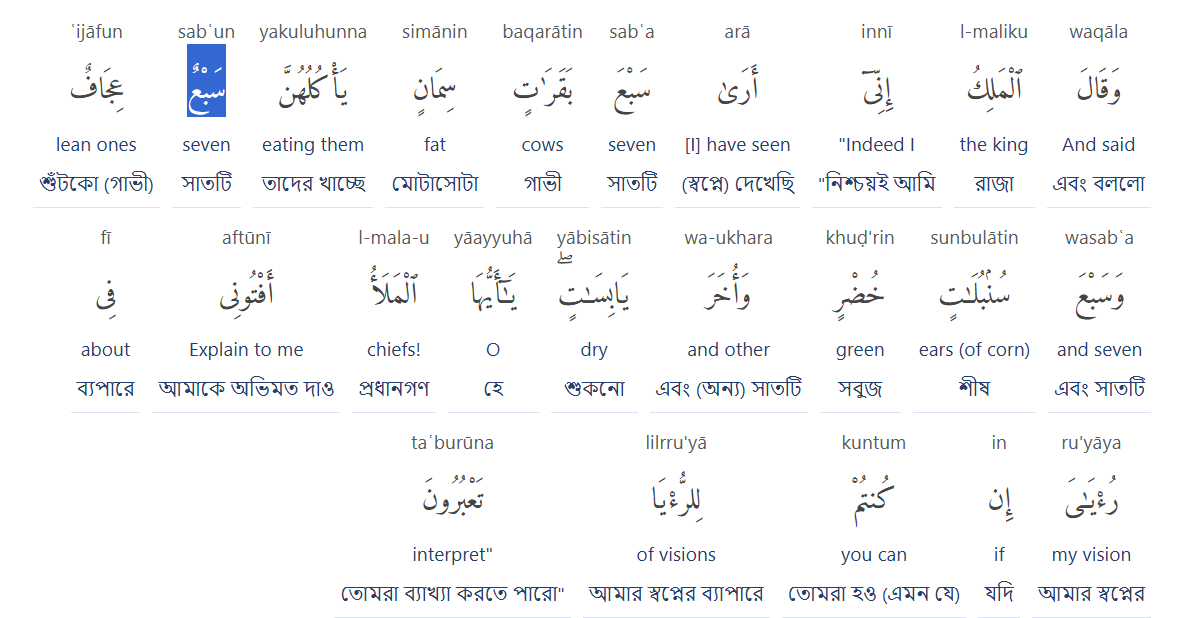 | “ইউসুফ, হে বিশ্বাসযোগ্য! আমাদের পরামর্শ দাও, সাতটি (অর্থাৎ, কিছু) মোটা গাভীকে শীর্ণকায় জন্তুরা (অর্থাৎ, শত্রুরা) খাচ্ছে, এবং কিছু মহিলা লম্বা পশ্চাদেশসহ সবুজ গাউন পরে আছে অন্যদের (নারীদের) সঙ্গী হয়ে, যারা কুঁকড়ে গেছে; এবং আমি জনগণের কাছে আমার মিশন পুনরায় শুরু করার জন্য (তথ্য সহ) ফিরে যাওয়ার আশা করি, এবং আমি আশা করি যে তারা (নির্দোষতা) নিশ্চিত করবে!” | “Yussuf, O credible one! Counsel us about seven (i.e., several) fat cows being fed on by emaciated beasts (i.e., enemies), and several ladies wearing long green gowns with train in the company of others (feminine) who are shriveled, and I hope to return (with information) to resume my mission to the people, and I hope that they ascertain (innocence)!” |