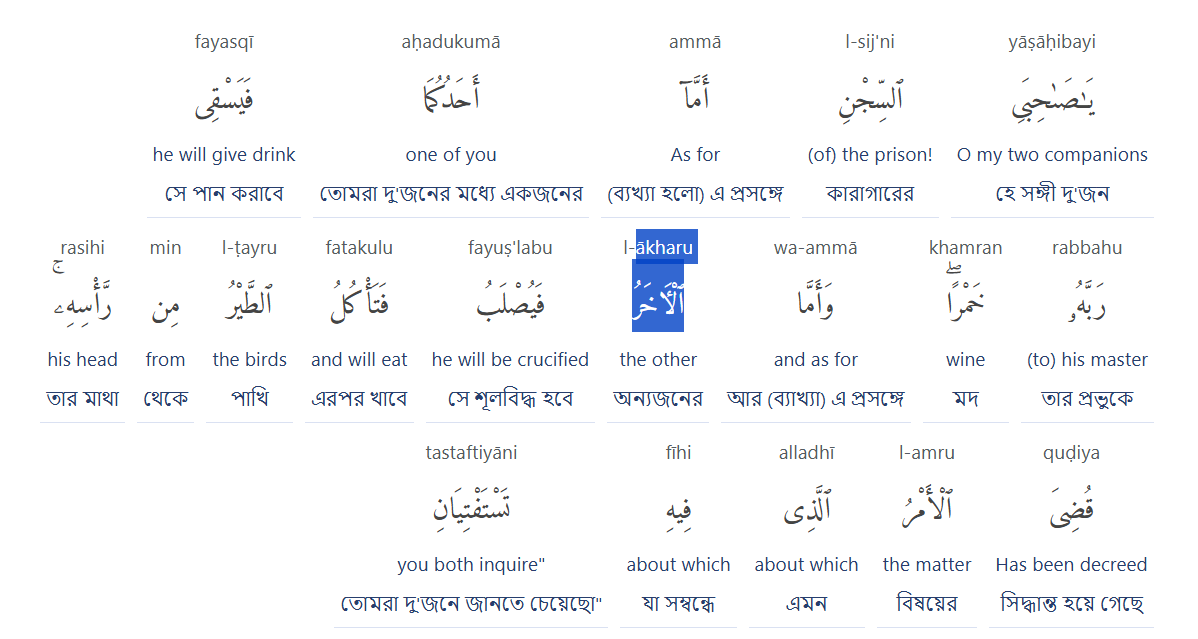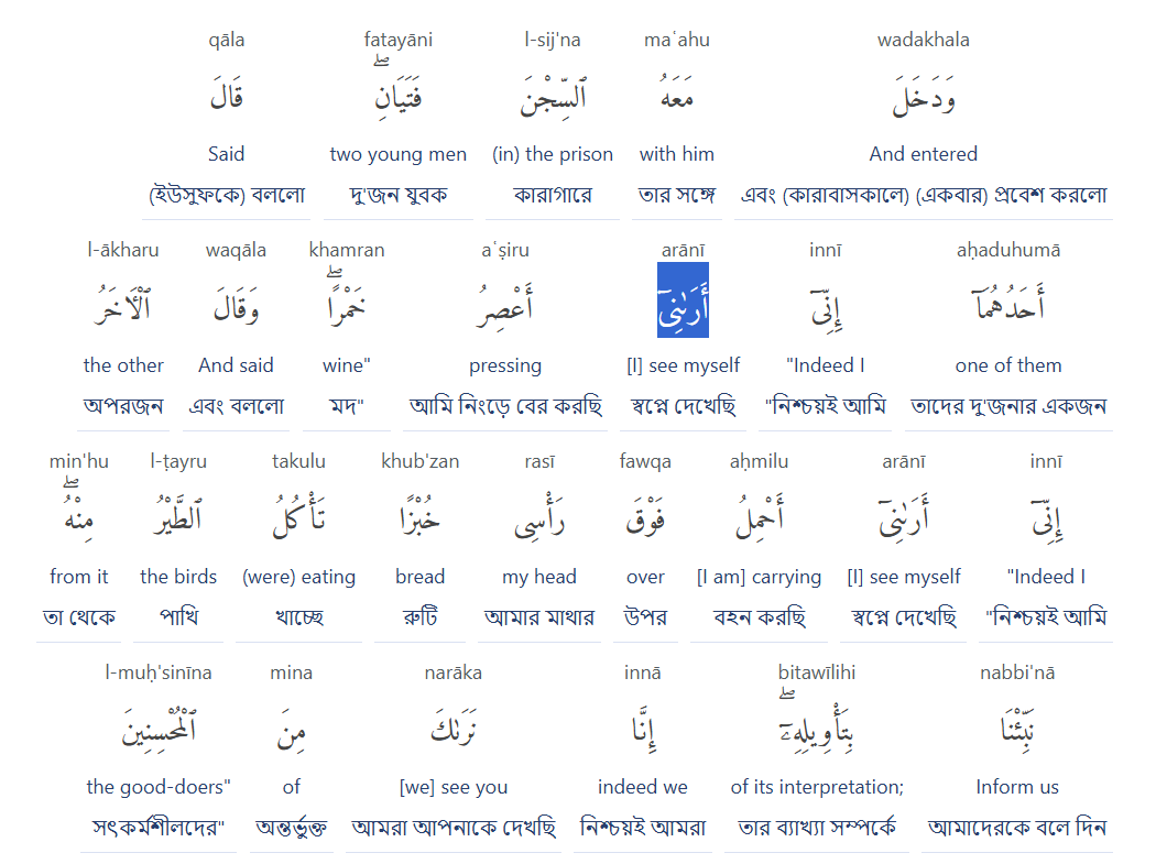 | এবং দুই ভৃত্য তার সাথে কারাগারে প্রবেশ করল। তাদের মধ্যে একজন বলল (ইউসুফকে): “আমি বিশ্বাস করি (আমি এখানে এসেছি কারণ) আমি মদ নিঙড়াই।” এবং অন্য একজন (অর্থাৎ ইউসুফ) বলল: “আমি বিশ্বাস করি (আমি এখানে এসেছি কারণ) ‘আমি আমার মাথার উপর কিছু রুটি বহন করি’ (অর্থাৎ, আমি নিজেকে জ্ঞানের কাছে সমর্পণ করি যা আমি শিখেছি), যা থেকে ‘তাইর’ (অর্থাৎ, ফেরেশতাগণ/শিক্ষকগন) খায় (অর্থাৎ, গ্রাস করে বা বোঝে)।” (কারাগারের দুই সঙ্গী বলল:) “এটি আমাদের জন্য ব্যাখ্যা করো (অর্থাৎ, তুমি যা বলেছ এবং প্রথম কারা-সঙ্গীকে যা বলা হয়েছিল তা ব্যাখ্যা করো), কারণ আমরা তোমাকে অন্তর্দৃষ্টি ধারণকারীদের মধ্যে দেখি।” | And two servants entered the prison with him. One of them said (to Yussuf): “I believe (I am here because) I press wine.” And one of the other ones (i.e. Yussuf) said: “I believe (I am here because) ‘I carry over my head some bread’ (i.e., I submit myself to knowledge I have learned,) of which the ‘Tayr’ (i.e., angels) eat (i.e., consume or understand)”. (The two prison mates said:) “Interpret it (i.e., explain for us what you said and what the first prison-mate was told) for us, for we see you among the insight-holders.” |